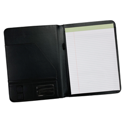 The Black Padfolio with Stripe is made of soft simulated leather with a contrasting vertical blue stripe and the Phi Theta Kappa Greek letters debossed on the front. The padfolio includes an 8-1/2” X 11” writing pad, internal file pockets, a business card holder and an elastic pen loop (pen not included).
