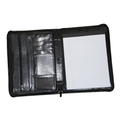 This black leather zippered portfolio includes various pockets for organization with the Greek letter logo debossed on front. 8 1/2 X 11″ notepad included.